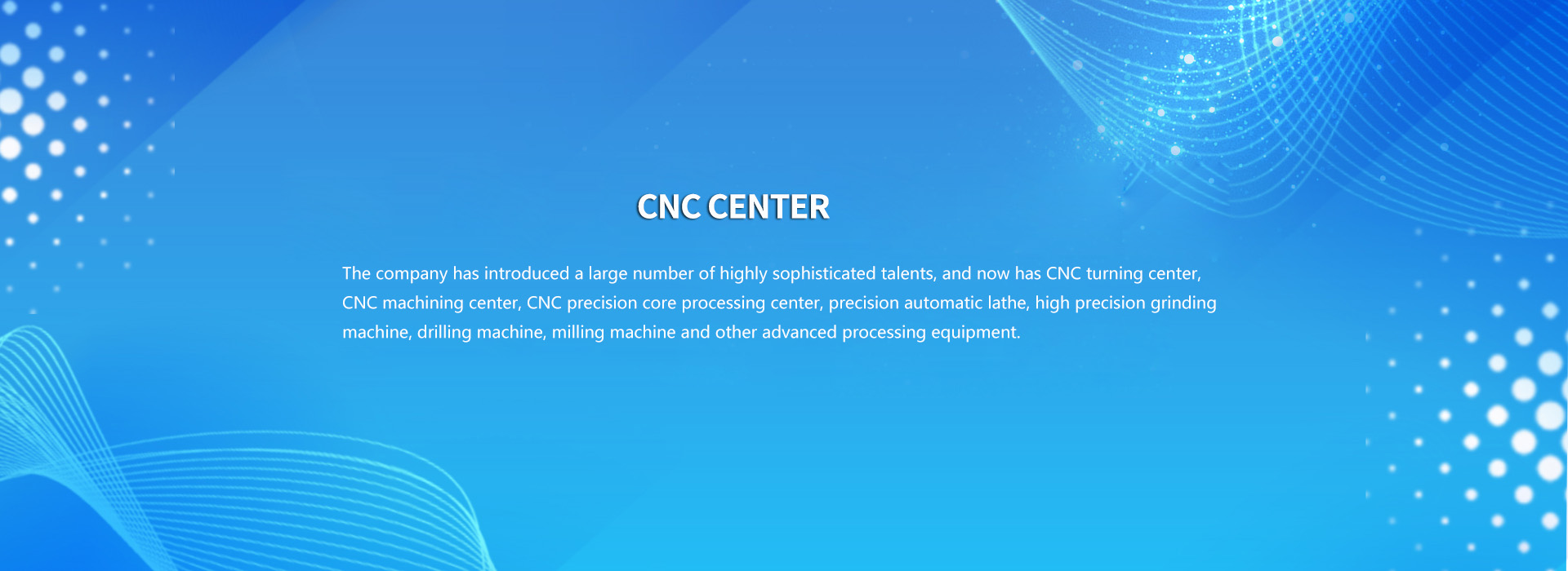 Now has CNC turning center, CNC machining center, CNC precision core processing center, precision automatic lathe, high precision grinding machine, drilling machine, milling machine and other advanced processing equipment.